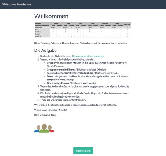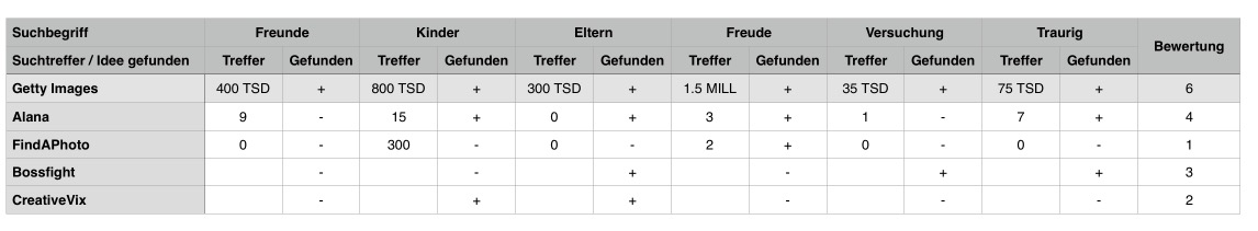 Um die Qualität eines Bildarchives für diesen Zweck zu beurteilen, haben wir versucht jeweils sechs solcher Motiv-Ideen zu finden. Die Suche nach dem passenden Bild durfte nicht länger als 2 Minuten dauern. Nicht alle Archive haben ihre Bilder mit Suchbegriffen versehen. Hier musste visuell "gestöbert" werden.