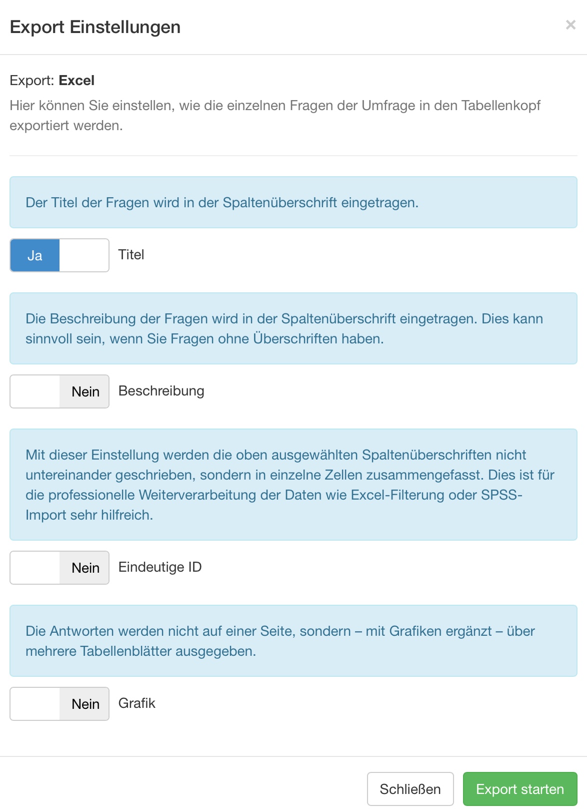 Ob der Titel und/oder die Beschreibung zusammen mit den Antworten im Tabellenkopf angezeigt werden soll, ist nun wählbar. Die Möglichkeit, alle Überschriften in einer einzigen Spalte zu integrieren (eindeutige ID) ist besonders für die Nutzer sinnvoll, die ihre Daten in statistische Auswertungstools importieren möchten.