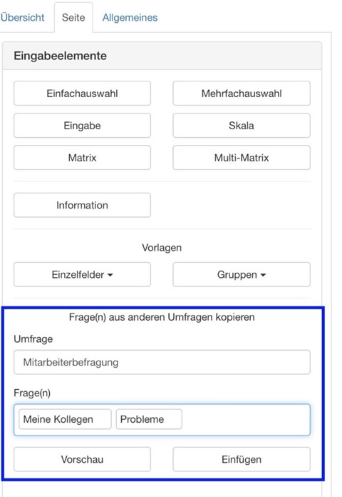 Unsere Pro-User können auf diese Funktion nun direkt bei den Elementen einer Seite zugreifen. Unter den Vorlagen kann eine Umfrage ausgewählt und beliebig viele Fragen daraus für die Übernahme ausgewählt und übernommen werden: