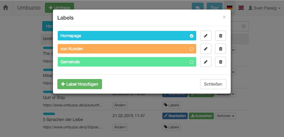 Beim Umzug ist leider zunächst ein beliebtes Pro-Feature vorlorengegangen: Die Möglichkeit, Umfragen mit beliebigen Labels zu versehen, um bei vielen Umfragen die Übersicht nicht zu verlieren (siehe The Butterfly Effect).